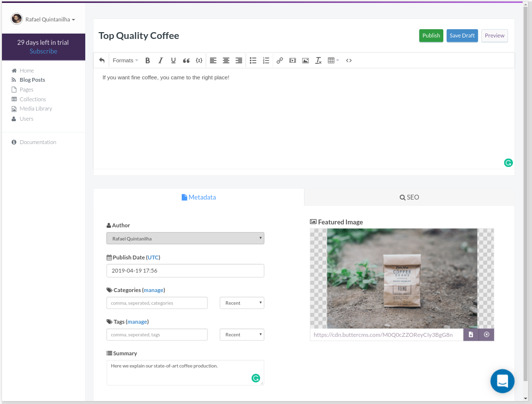 To illustrate how easy adding new content can be, let’s open Butter’s admin panel, click on Blog Posts and create a new post by adding some content and hitting Publish: