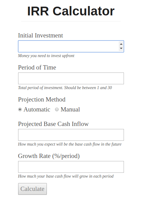 Our goal then is to compare multiple investments and analyze their IRRs in order to make better financial choices. It applies to a wide range of endeavors -- from opening a new restaurant to buying AAPL stocks. The online calculator should be, then, simple to use and quick to test multiple assumptions. Let's assess our requirements.