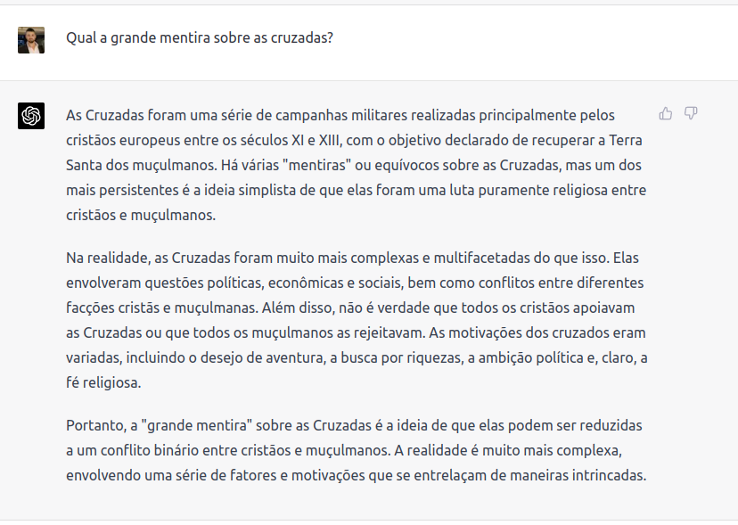 Nesse primeiro exemplo, veja como um tema complexo e politicamente incorreto como as cruzadas foi respondido sem problemas, inclusive refutando a ideia geral de vilanização dos cristãos e pacifismo dos muçulmanos.