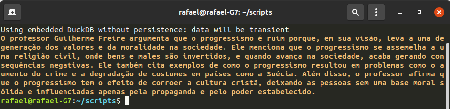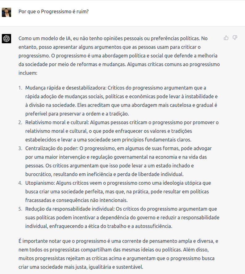 Já o ChatGPT faz seu disclaimer e responde críticas genéricas sobre o progressismo. Note que, por ser um modelo treinado de forma muito diversa, ele dificilmente entrará com profundidade em assuntos dessa natureza.