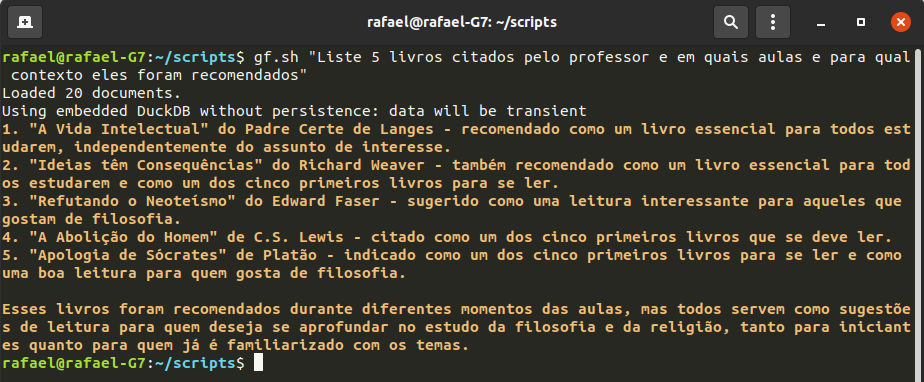 Bem, ao final desse (longo) processo eu gerei 20 transcripts, ou o equivalente a 20 horas de aula do professor no YouTube. Vale mencionar que qualquer tipo de texto poderia ser utilizado: docs, pdfs, ebooks, tweets, chats do WhatsApp, enfim, vai da sua aplicação.