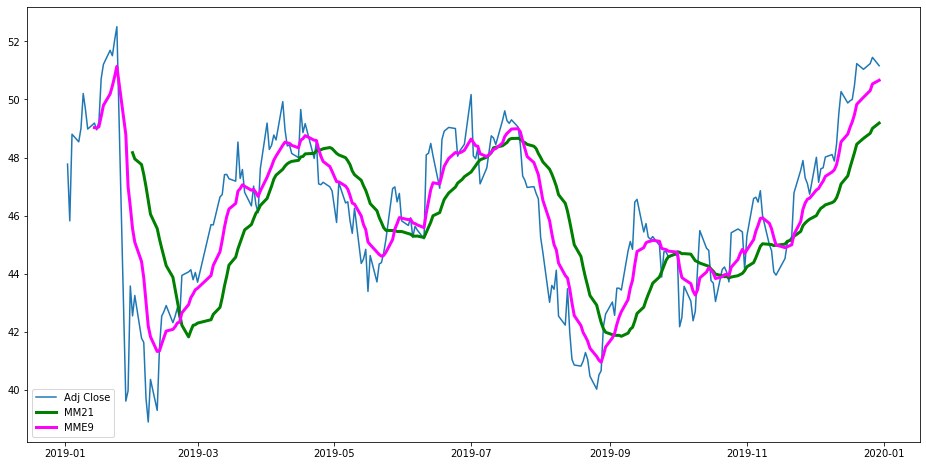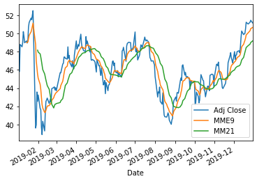 Novamente simples, como o esperado. Passando um array de colunas ["Adj Close", "MME9", "MM21"] somos capazes de, em uma linha, plotar os 3 valores e automaticamente adicionar uma legenda.