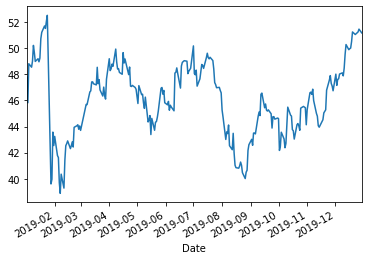 print(all_closes)Date 2019-01-02 47.774075 2019-01-03 45.819725 2019-01-04 48.802681 2019-01-07 48.540855 2019-01-08 49.008404 ... 2019-12-20 51.233932 2019-12-23 51.037563 2019-12-26 51.233932 2019-12-27 51.449287 2019-12-30 51.161327 Name: Adj Close, Length: 247, dtype: float64