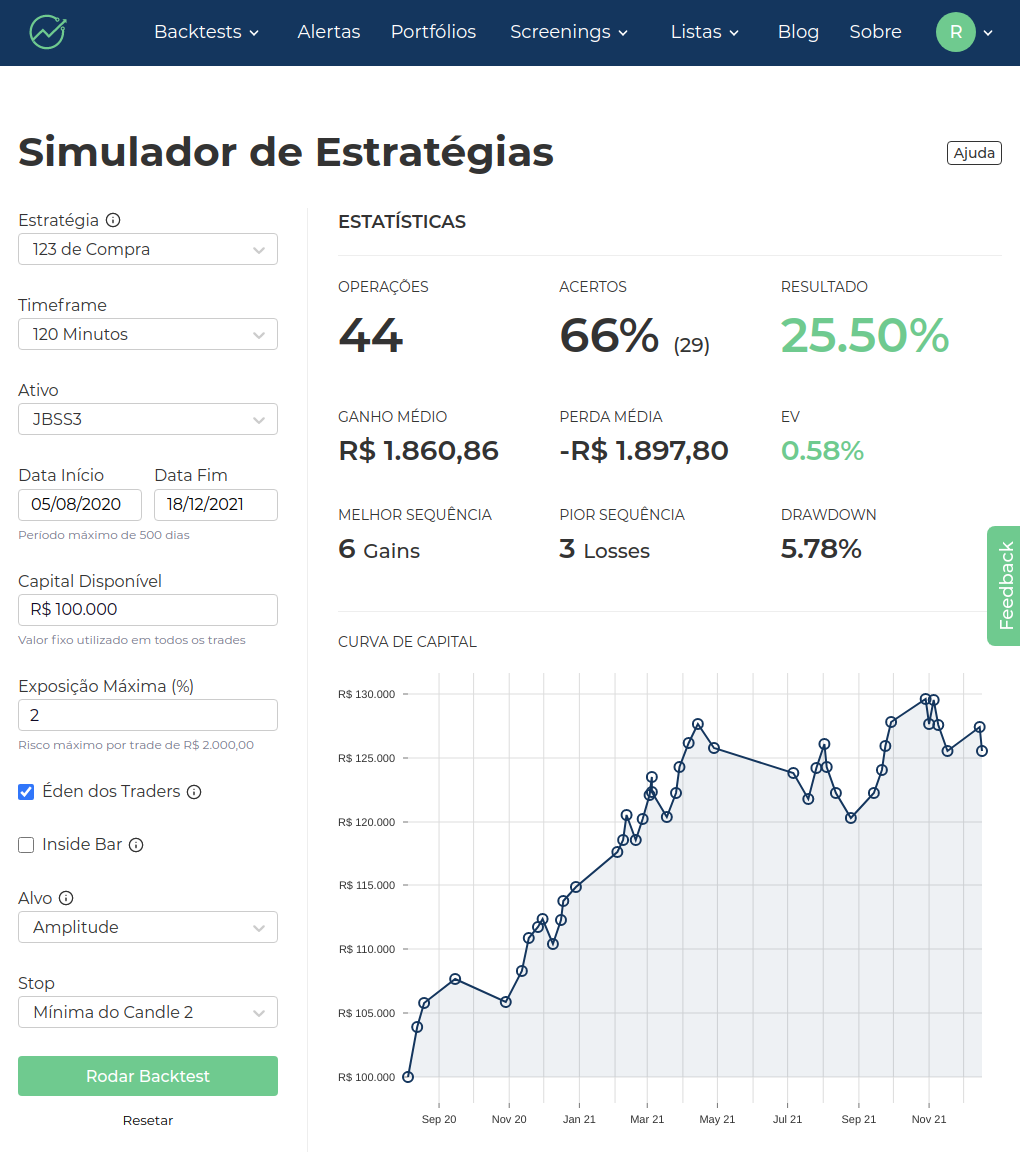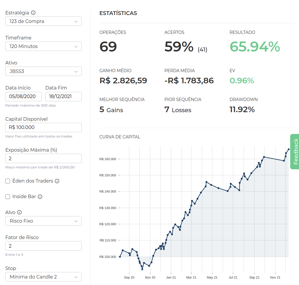 O resultado a seguir é o resultado da estratégia do 123 de Compra para JBSS3 nos 120 minutos quando esse ativo está no Éden dos Traders: