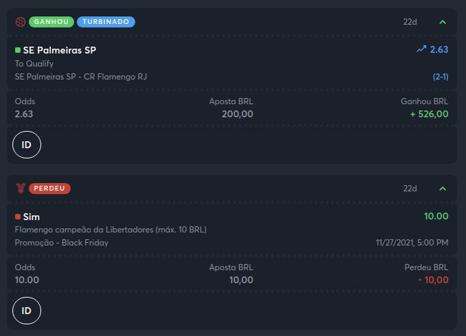- R$200 no título do Palmeiras, que caso se concretizasse me retornaria R$526.