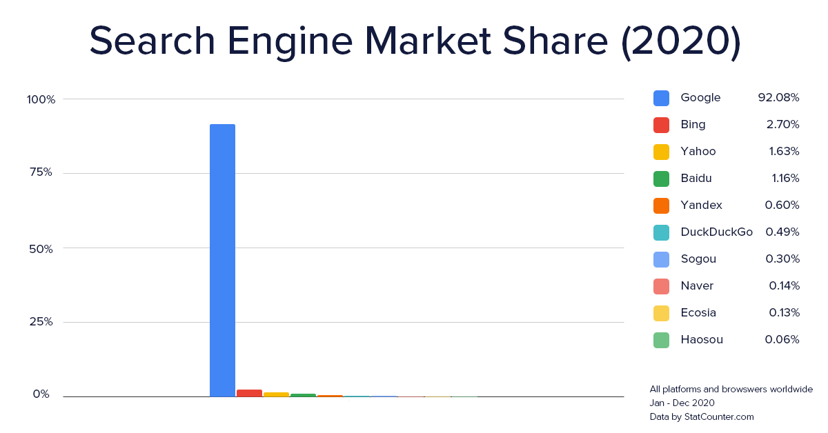 Google owns 92% of the search engine market share worldwide and this number has been fairly steady since 2009. It makes sense, then, to target Google and what it considers good practice when developing your SEO strategy.