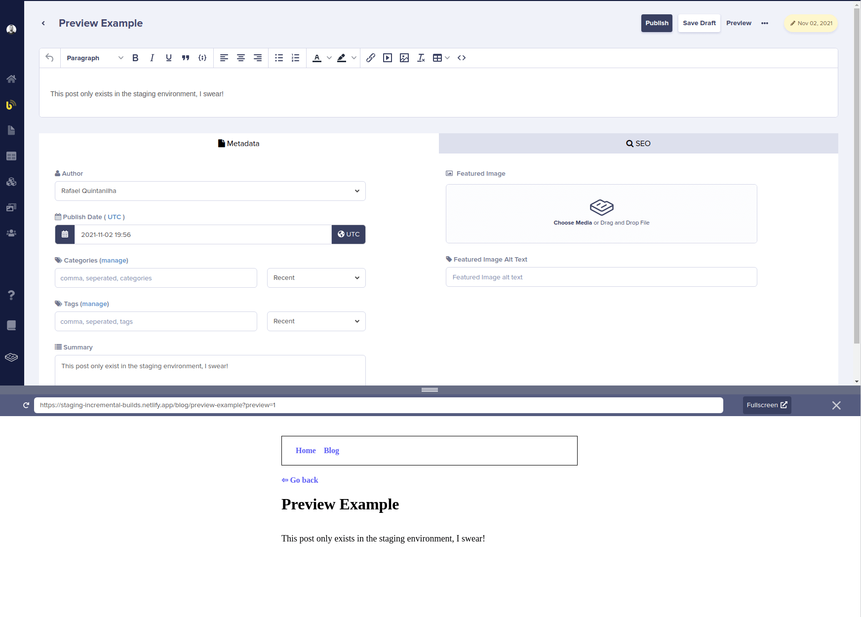 As is, our app already has a working preview environment: every time a new draft post is created or saved, a webhook will be triggered to rebuild our staging site in Netlify. This way, content creators can iterate and observe how it looks on the real page before actually publishing to the production site.