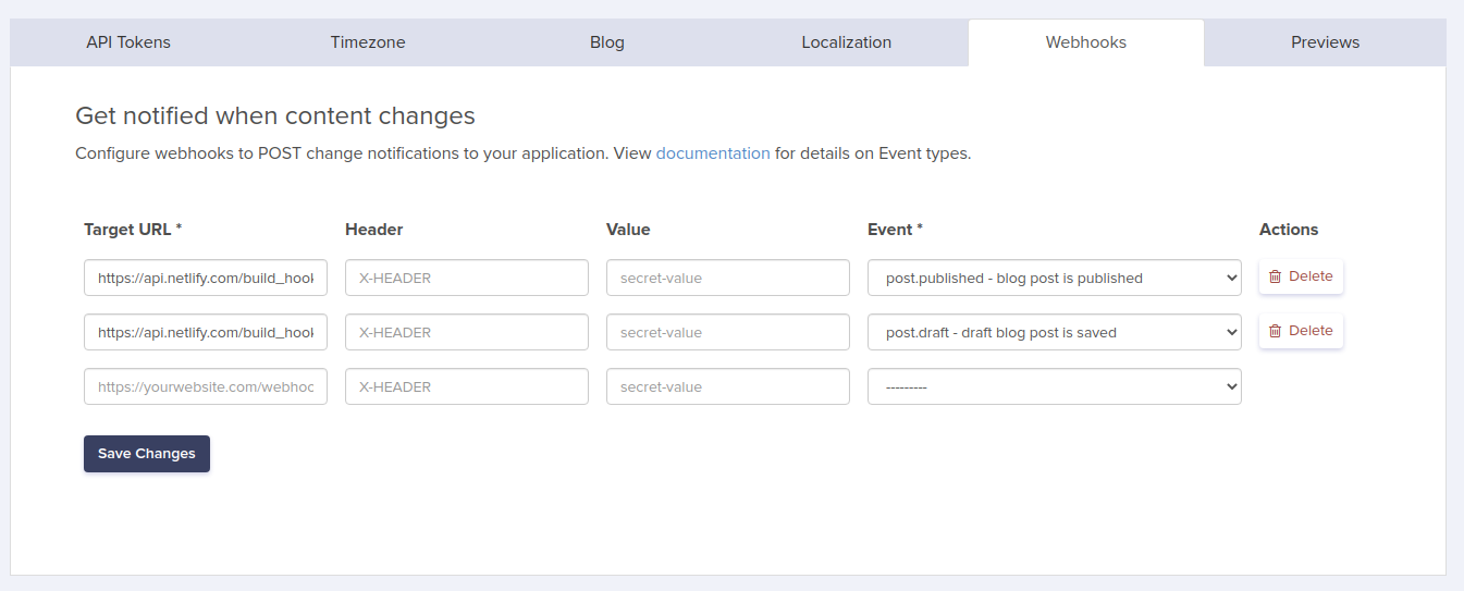 Next, repeat Step 5 and create a new webhook both in Netlify and ButterCMS. Make sure to add the URL generated by Netlify as the Target URL in Butter’s Webhooks tab and, this time, select post.draft - draft post is saved in the Event field. Your Butter’s webhooks should look like this: