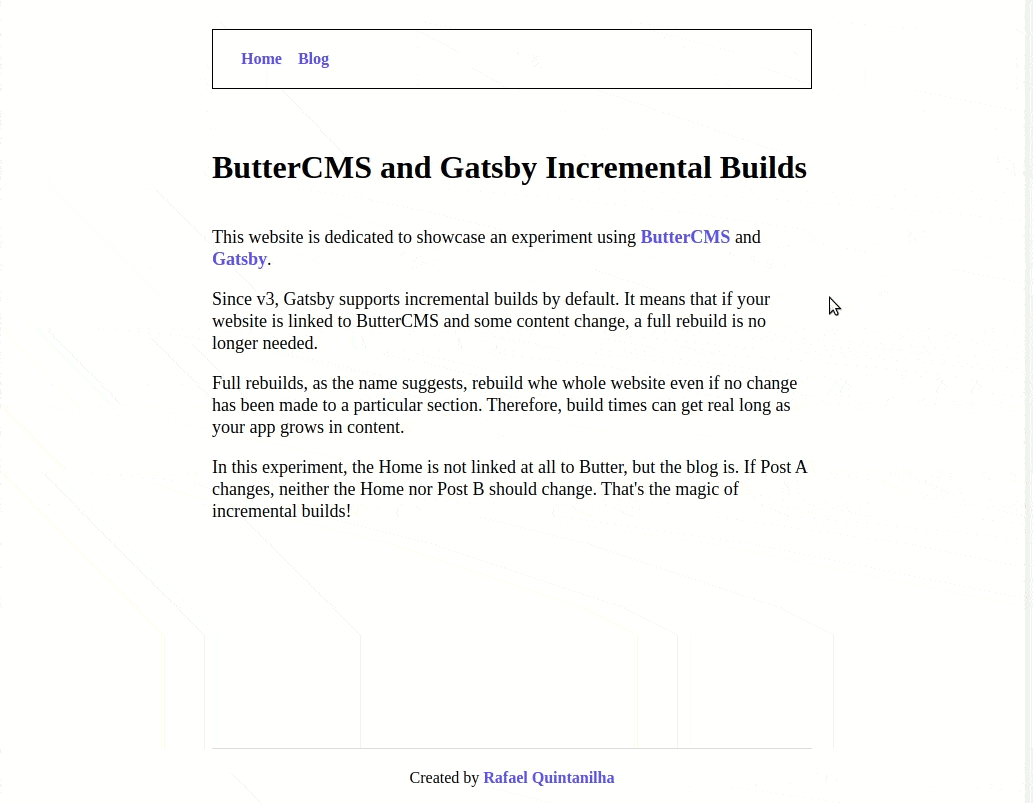 export default PostTemplate;For the sake of simplicity, I’m not going into Gatsby’s details in this tutorial, but you have access to the full code at https://github.com/ButterCMS/gatsby-incremental-builds. A live example can be found at https://incremental-builds.netlify.app/.