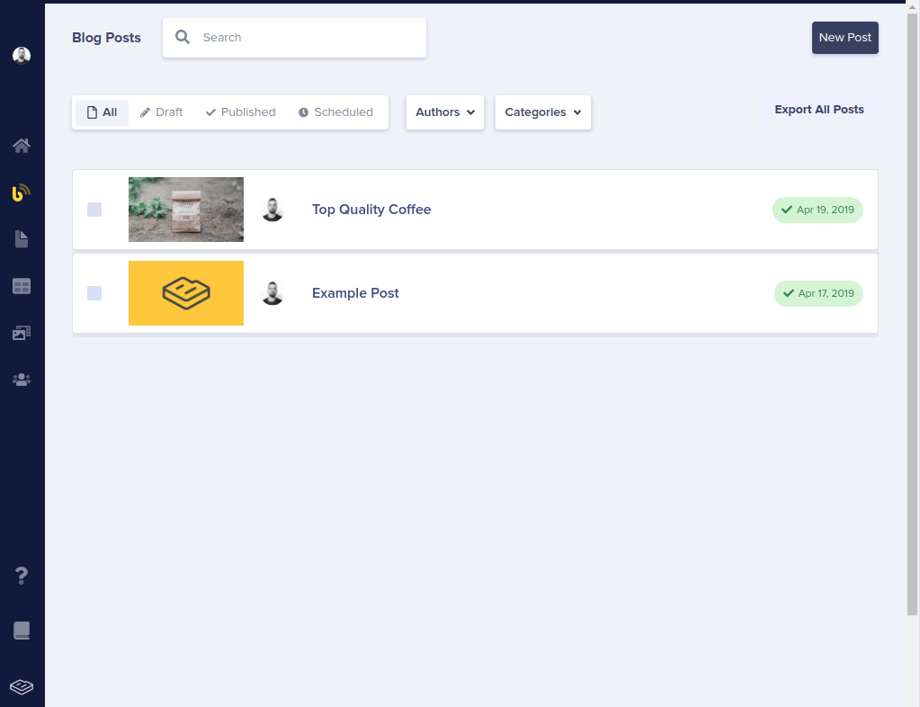 In Butter’s admin panel, click on “Blog posts” in the side menu and add a couple of entries. In the end, it should look something like this: