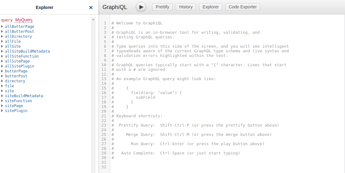 }Replacing YOUR_TOKEN with the token you grabbed from Butter’s panel before. If everything is correct, start the Gatsby server again and go to http://localhost:8000/___graphql where you should be able to see this: