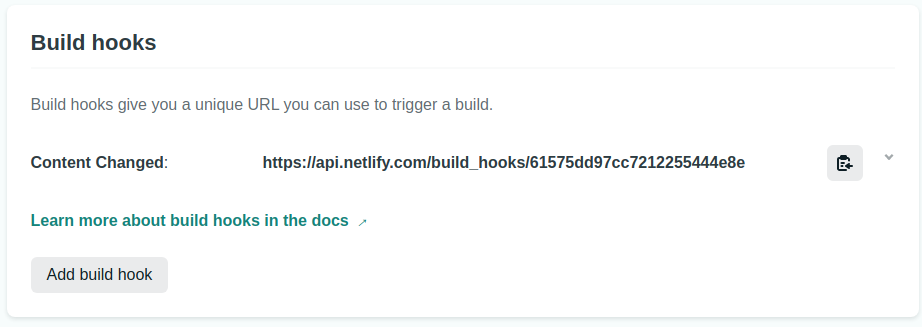 In Netlify, go to “Site settings” and then “Build & deploy.” Scroll down to “Build hooks” and click on “Add build hook”. Give it a descriptive name and, in the end, you should see something like this: